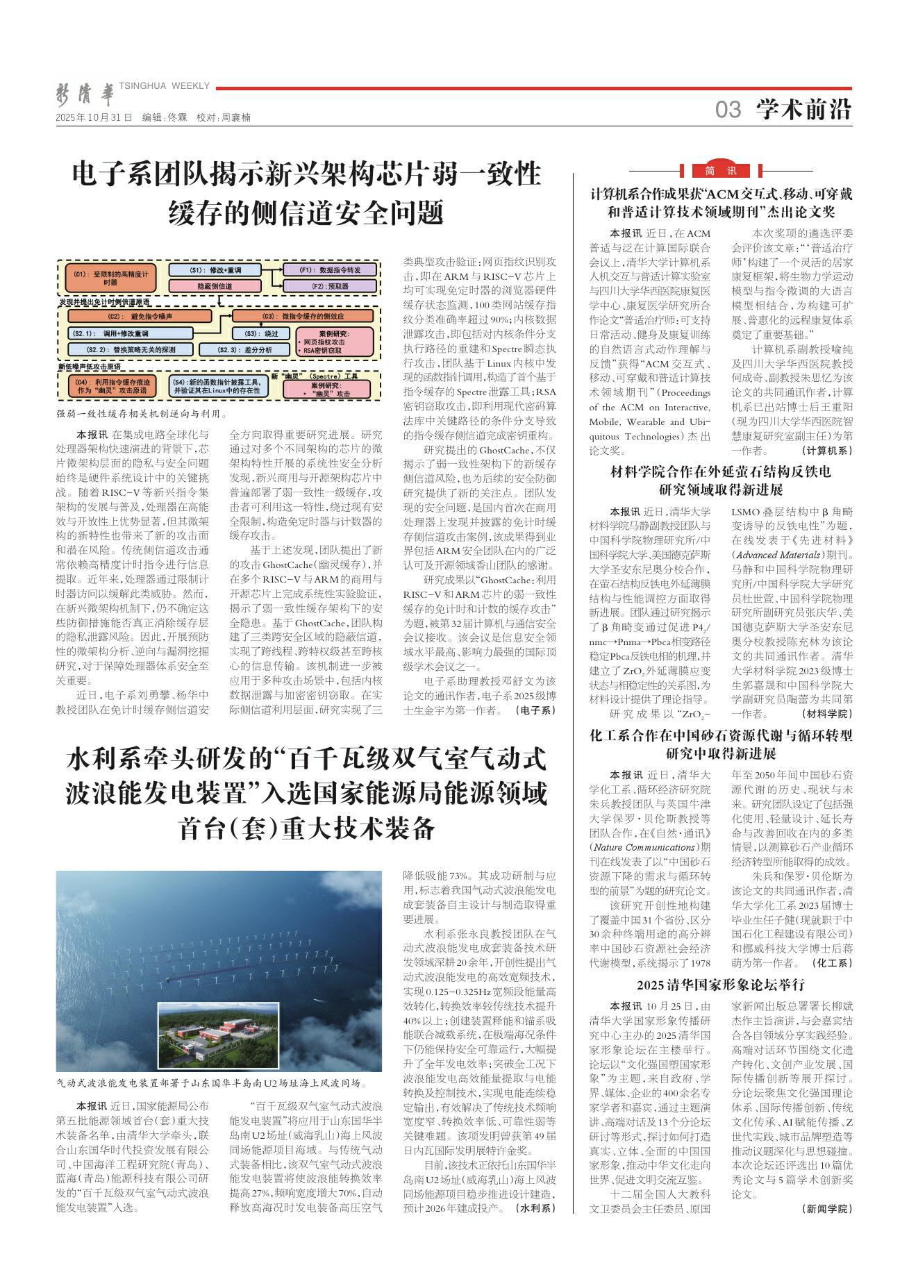 电子系团队揭示新兴架构芯片弱一致性缓存的侧信道安全问题 水利系牵头研发的“百千瓦级双气室气动式波浪能发电装置”入选国家能源局能源领域首台(套)重大技术装备 计算机系合作成果获“ACM交互式、移动、可穿戴和普适计算技术领域期刊”杰出论文奖 材料学院合作在外延萤石结构反铁电研究领域取得新进展 化工系合作在中国砂石资源代谢与循环转型研究中取得新进展 2025清华国家形象论坛举行