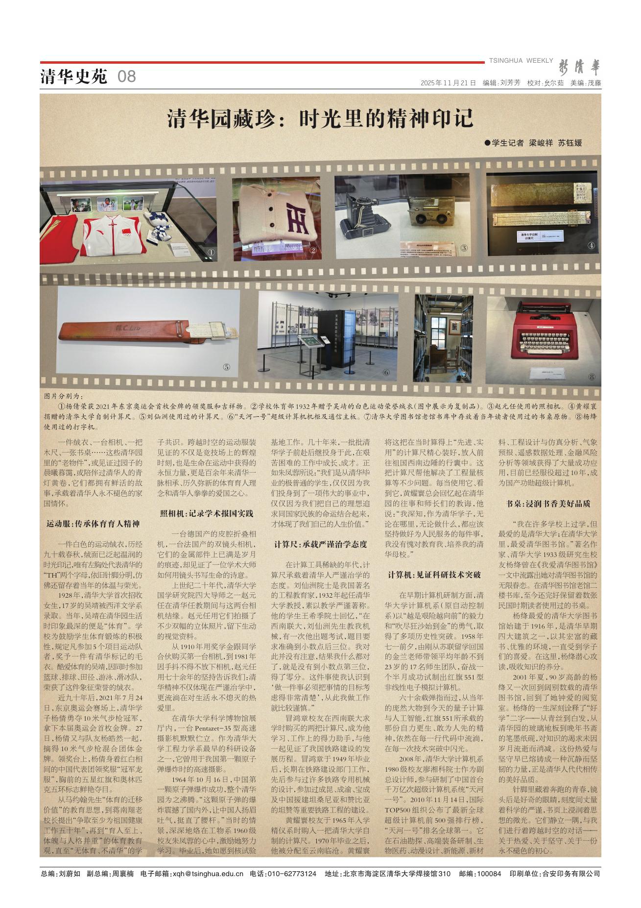图片分别为:①杨倩荣获2021年东京奥运会首枚金牌的领奖服和吉祥物。②学校体育部1932年赠予吴靖的白色运动荣誉绒衣(图中展示为复制品)。③赵元任使用的照相机。④黄耀寰捐赠的清华大学自制计算尺。⑤刘仙洲使用过的计算尺。⑥“天河一号”超级计算机机柜及通信主板。⑦清华大学图书馆老馆书库中存放着当年读者使用过的书桌原物。⑧杨绛使用过的打字机。