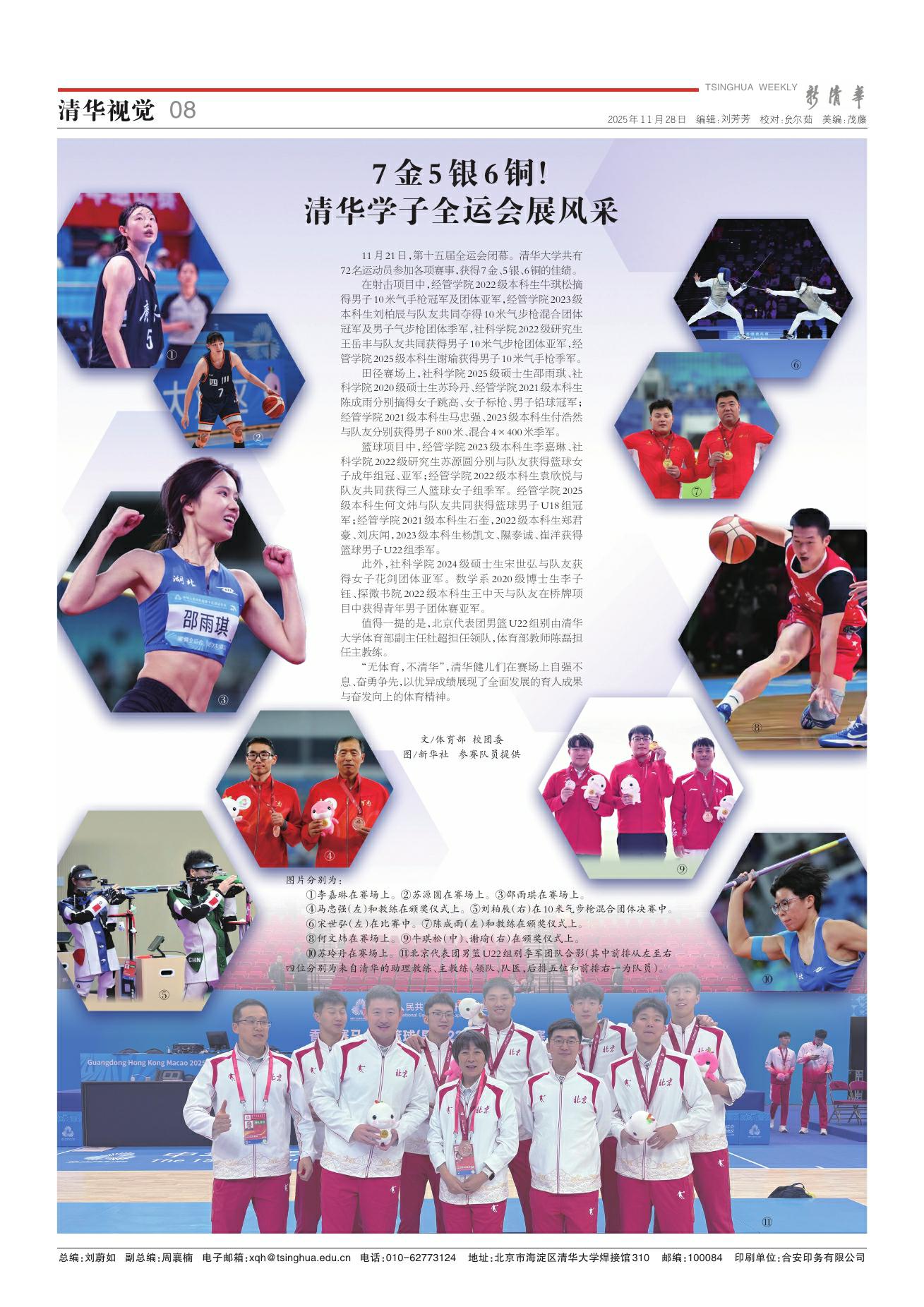 ①李嘉琳在赛场上。②苏源圆在赛场上。③邵雨琪在赛场上。④马忠强(左)和教练在颁奖仪式上。⑤刘柏辰(右)在10米气步枪混合团体决赛中。⑥宋世弘(左)在比赛中。⑦陈成雨(左)和教练在颁奖仪式上。⑧何文炜在赛场上。⑨牛琪松(中)、谢瑜(右)在颁奖仪式上。⑩苏玲丹在赛场上。⑪北京代表团男篮U22组别季军团队合影(其中前排从左至右四位分别为来自清华的助理教练、主教练、领队、队医,后排五位和前排右一为队员)。