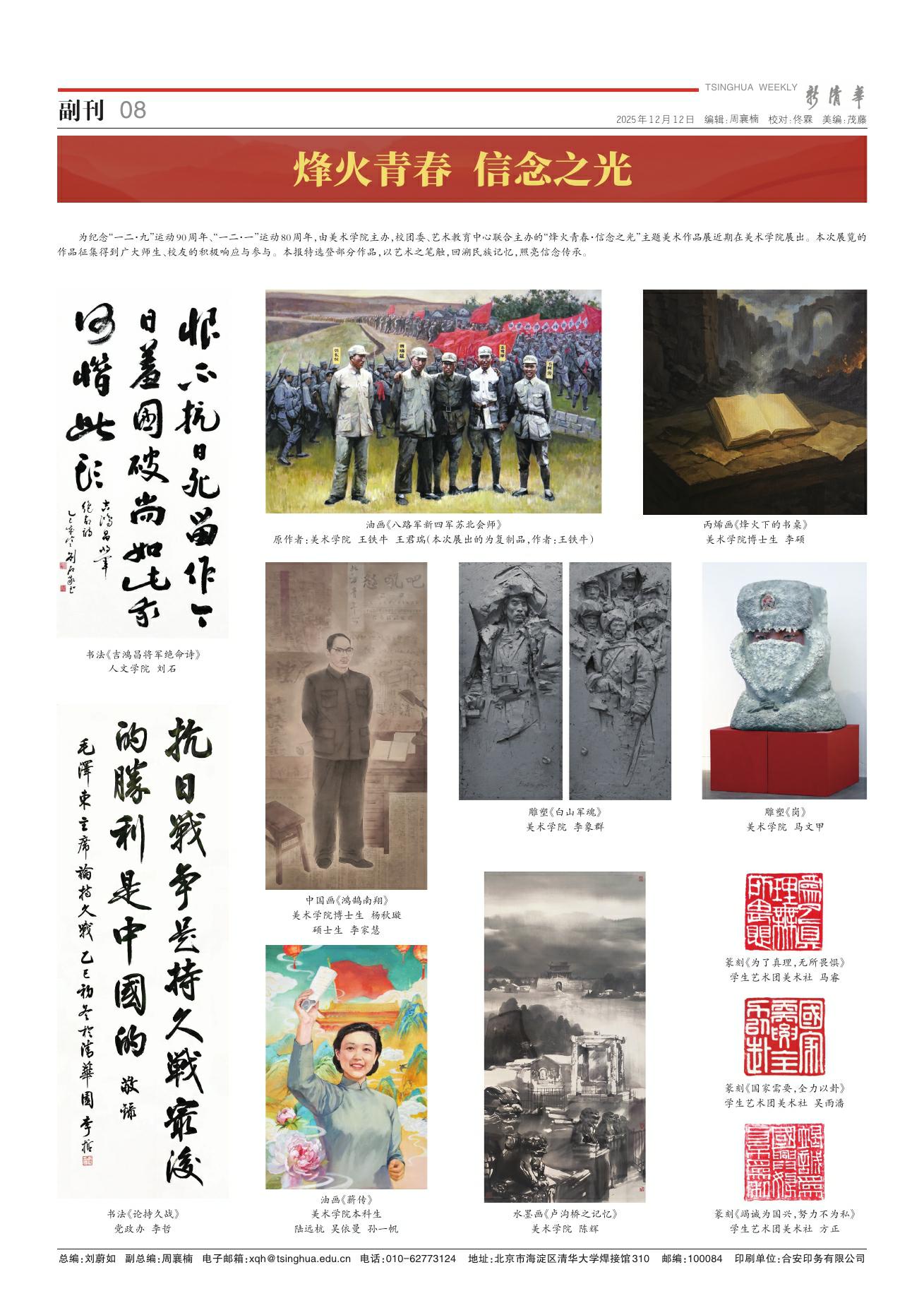 为纪念“一二·九”运动90周年、“一二·一”运动80周年,由美术学院主办,校团委、艺术教育中心联合主办的“烽火青春·信念之光”主题美术作品展近期在美术学院展出。本次展览的作品征集得到广大师生、校友的积极响应与参与。本报特选登部分作品,以艺术之笔触,回溯民族记忆,照亮信念传承。