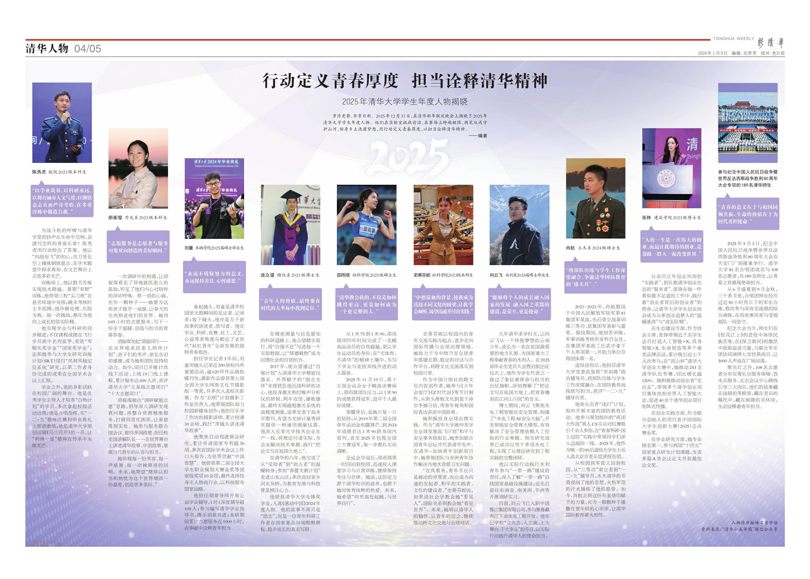 岁序更替,华章日新。2025年12月31日,在清华新年联欢晚会上揭晓了2025年清华大学学生年度人物。他们在实验室挑战前沿、在赛场上跨越极限、携笔从戎守护山河、俯身乡土浇灌梦想,用行动定义青春厚度,以担当诠释清华精神。