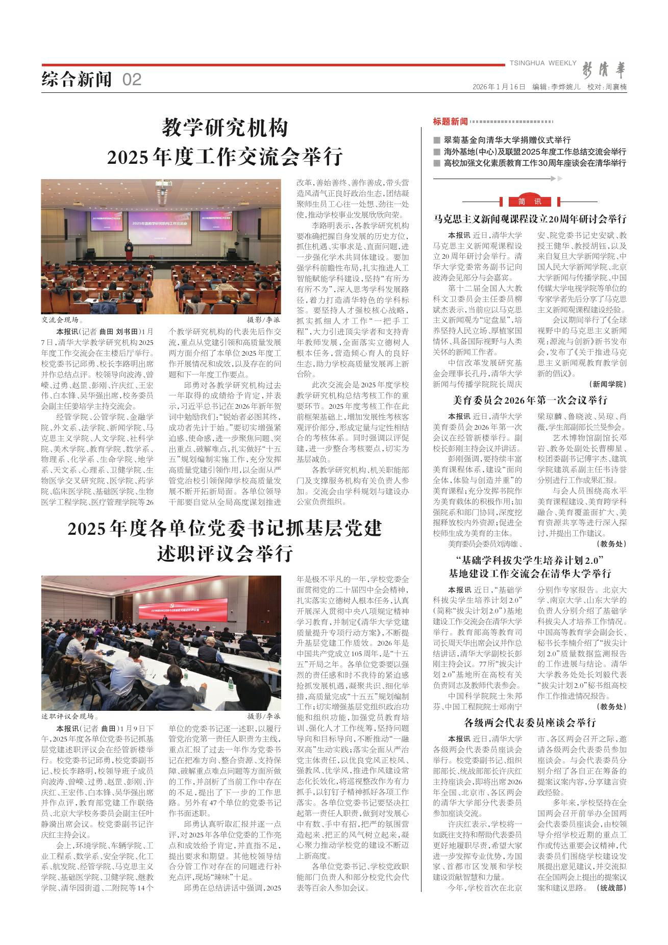 邱勇在总结讲话中强调,2025年是极不平凡的一年,学校党委全面贯彻党的二十届四中全会精神,扎实落实立德树人根本任务,认真开展深入贯彻中央八项规定精神学习教育,并制定《清华大学党建质量提升专项行动方案》,不断提升基层党建工作质效。2026年是中国共产党成立105周年,是“十五五”开局之年。各单位党委要以强烈的责任感和时不我待的紧迫感抢抓发展机遇,凝聚共识、细化举措,高质量完成“十五五”规划编制工作;切实增强基层党组织政治功能和组织功能,加强党员教育培训、强化人才工作统筹,坚持问题导向和目标导向,不断推动“一融双高”生动实践;落实全面从严治党主体责任,以优良党风正校风、强教风、优学风,推进作风建设常态化长效化,将巡视整改作为有力抓手,以钉钉子精神抓好各项工作落实。各单位党委书记要坚决扛起第一责任人职责,做到对发展心中有数、手中有招,把严的氛围营造起来、把正的风气树立起来,凝心聚力推动学校党的建设不断迈上新高度。