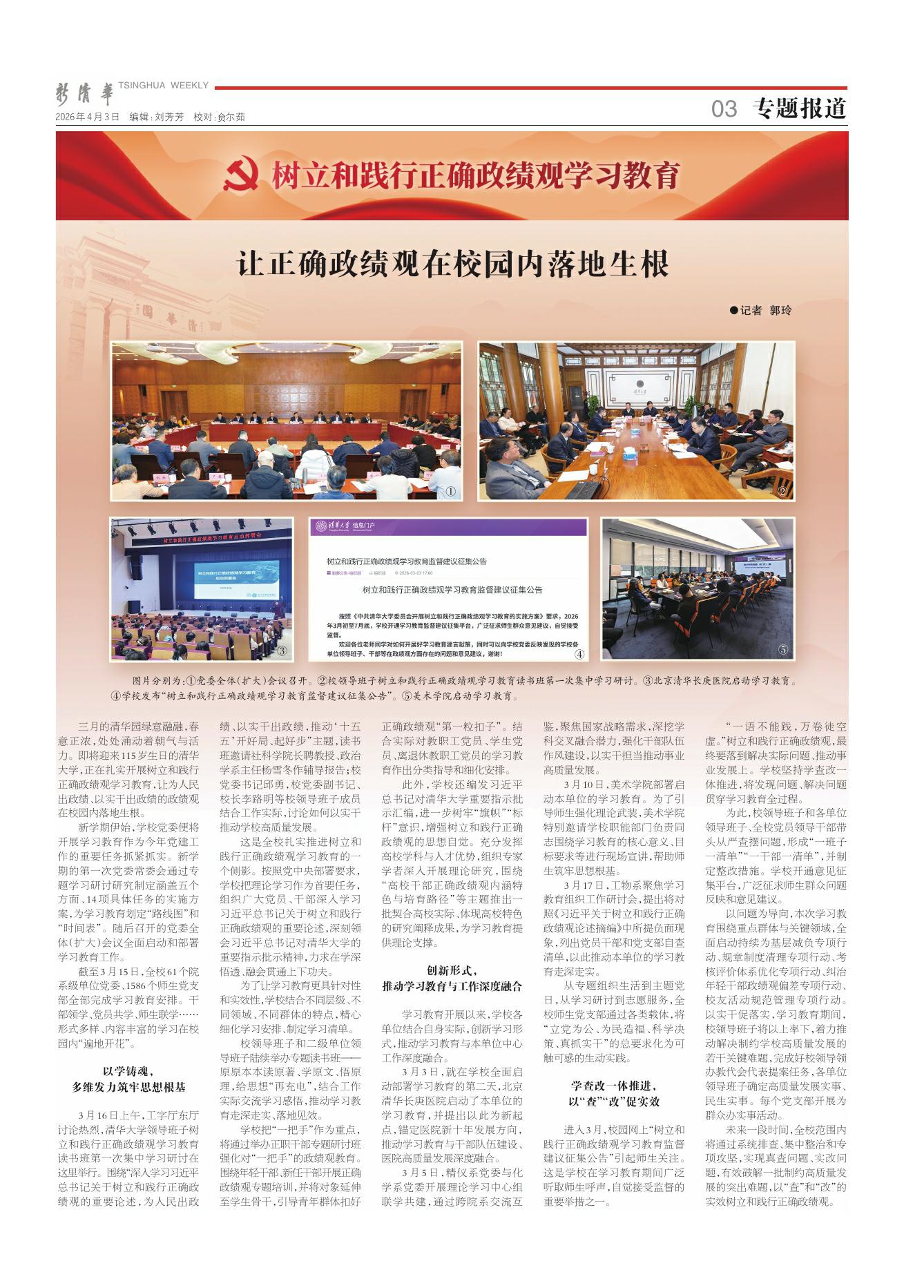图片分别为:①党委全体(扩大)会议召开。②校领导班子树立和践行正确政绩观学习教育读书班第一次集中学习研讨。③北京清华长庚医院启动学习教育。④学校发布“树立和践行正确政绩观学习教育监督建议征集公告”。⑤美术学院启动学习教育。